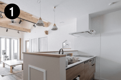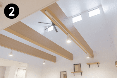2階リビングならではの勾配天井。天井が高くなる部分ができることで圧迫感が軽減され、開放感と立体感が生まれます。実際以上に広く感じられ、ゆとりをつくります。