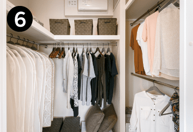 セントラル収納で家族の衣類をまとめて収納するクローク。